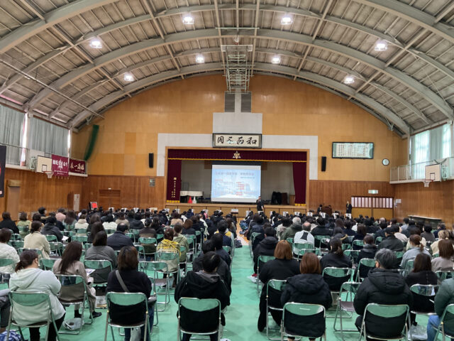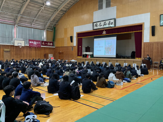 体育館で行われた全体会では、学校長の挨拶から始まり、各科コースの特徴や令和8年度入試についての詳細が話されました。
