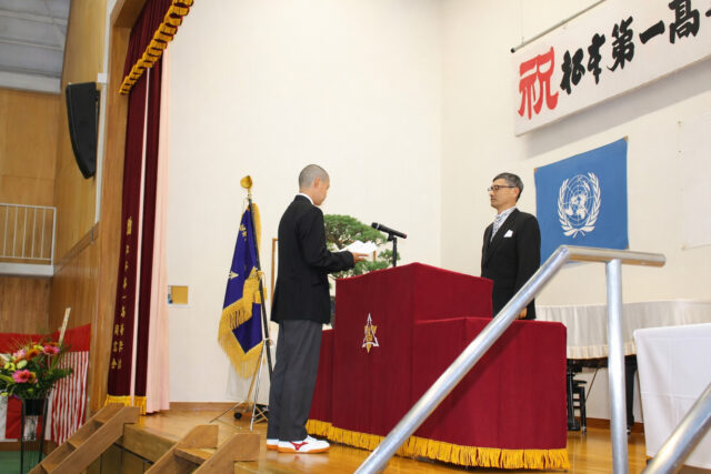 塩野英雄校長の式辞では、今年度からコースが再編された特別探究コースと総合探究コースについて触れられ、