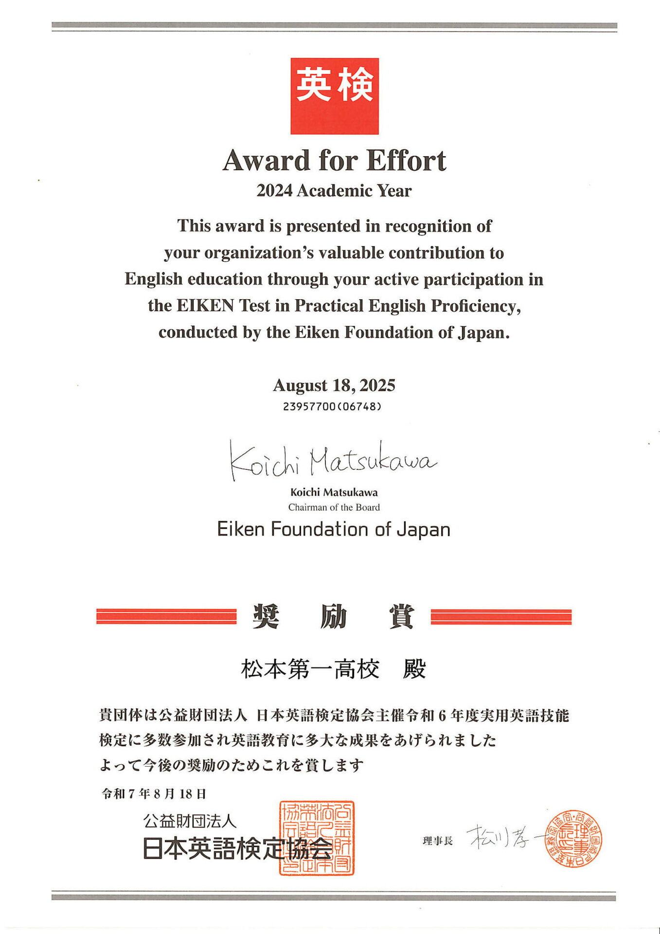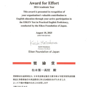 2023年度に引き続き、英検奨励賞 “Award for Effort -2024 Academic Year-” を受賞しました!